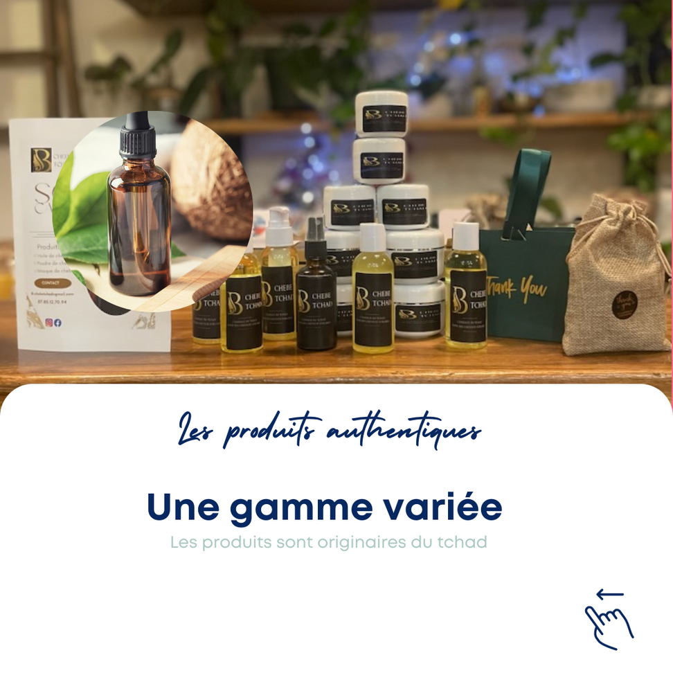 Poudre de Chébé et notre masque, une formule authentique héritée des traditions tchadiennes. Les femmes du Tchad ont préservé ce secret pour des cheveux somptueux depuis des générations. L'Authentique Huile de Chébé Plongez dans l'héritage millénaire des femmes tchadiennes avec notre huile de Chèbè 100% authentique. Savamment élaborée à partir d'ingrédients naturels du Tchad, cette huile est un trésor de beauté pour des cheveux resplendissants.