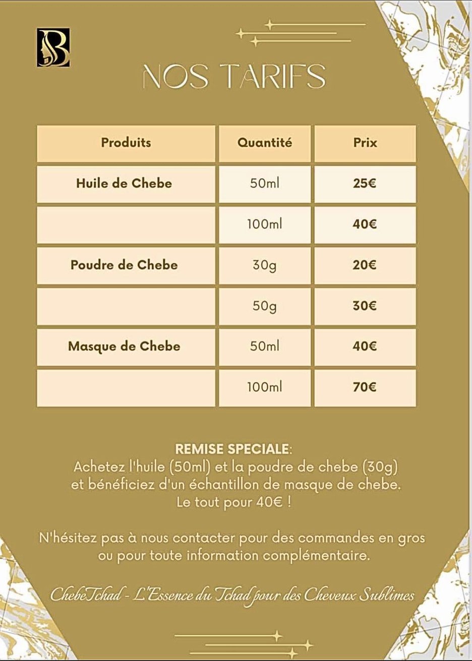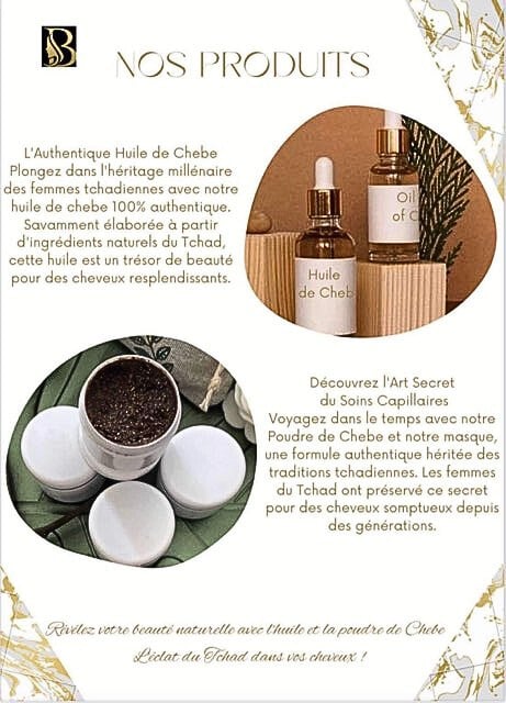 ChébéTchad est une entreprise passionnée par les secrets de beauté traditionnels qui ont été transmis de génération en génération par les femmes tchadiennes. Nous sommes fiers de vous offrir des produits de chébé de la plus haute qualité, conçus pour sublimer vos cheveux et révéler leur plein potentiel.